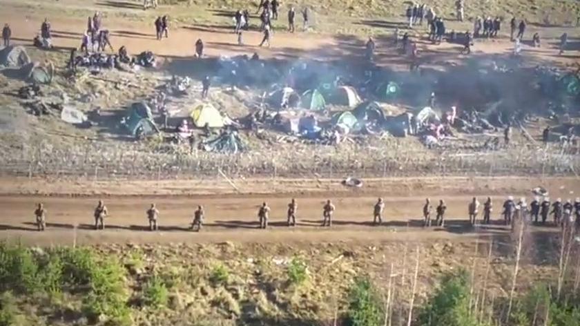 Sytuacja na granicy z białorusią. Granica z białorusią migranci. Widać na nich jak setki migrantów znajdujących się po białoruskiej stronie granicy próbuje sforsować.